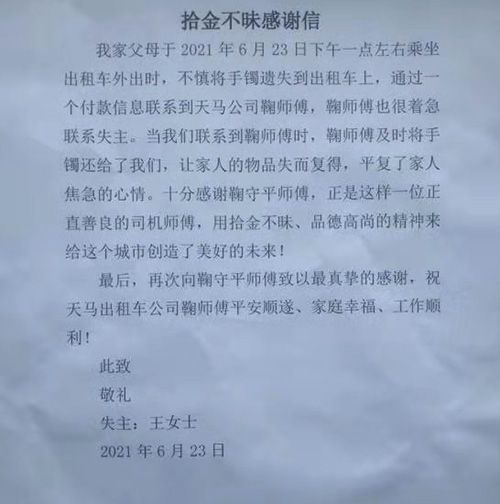 拾金不昧是中華民族的傳統(tǒng)美德,既是主流價(jià)值觀倡導(dǎo)“品德修養(yǎng)·潔身自愛(ài)”的人文瑰寶,更是華夏兒女傳承的非物質(zhì)文化遺產(chǎn)。2021年6月23號(hào),一位老人在乘坐我們泰安旅汽天馬出租公司鞠守平師傅的出租車時(shí)不慎將拿去清洗的金手鐲遺落在車上。事發(fā)后,鞠師傅聯(lián)系不上失主,馬上將乘客遺失的物品交回公司,天馬出租公司劉經(jīng)理?yè)?dān)心失主著急,經(jīng)過(guò)多方聯(lián)系以及泰安市交通局出租辦的幫助,終于聯(lián)系上了正在著急的老人,并將物品歸還給失主。失主感動(dòng)不已,說(shuō)天馬出租的鞠師傅有一顆金子般的心,并委托朋友為鞠師傅送來(lái)了感謝信和錦旗。